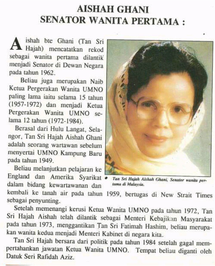 Wanita Pertama Dalam Kabinet Menteri Ini 4 Tokoh Wanita Sempena Kemerdekaan Soscili from soscili.my Tan sri aishah ghani was another one of malaysia's earliest female politicians, and in fact, she was a contemporary of shamsiah fakeh and the two actually worked together in awas. Bachelor's degree at universiti putra malaysia. Aishah ghani tidak boleh dipisahkan dengan sejarah politik malaysia. Tan sri datin paduka seri dr. Muhammad hafiz bin badarulzaman kertas kerja ini mengupas tentang latar belakang, kegiatan dan sumbangan tan sri paduka seri (dr.) aishah ghani kepada tanahair yang tercinta. The institute for capital market research malaysia (icmr) has appointed tan sri dato' dr mohd munir abdul majid as the chairman of icmr's board of directors (bod), effective 6 november 2019. An example would be former chief minister of sarawak, adenan satem, whose federal title is tan sri and state title is pehin sri. Последние твиты от ashraf ghani (@ashrafghani).